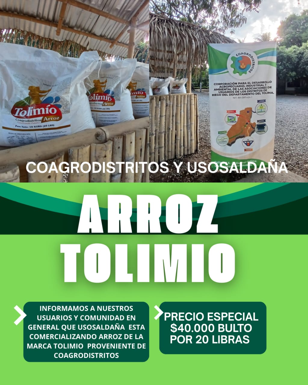 Informamos a nuestros Usuarios y comunidad en general que USOSALDAÑA está comercializando arroz marca Tolimio, proveniente de Coagrodistritos, a un precio especial de $40.000 pesos por bulto de 20 libras.